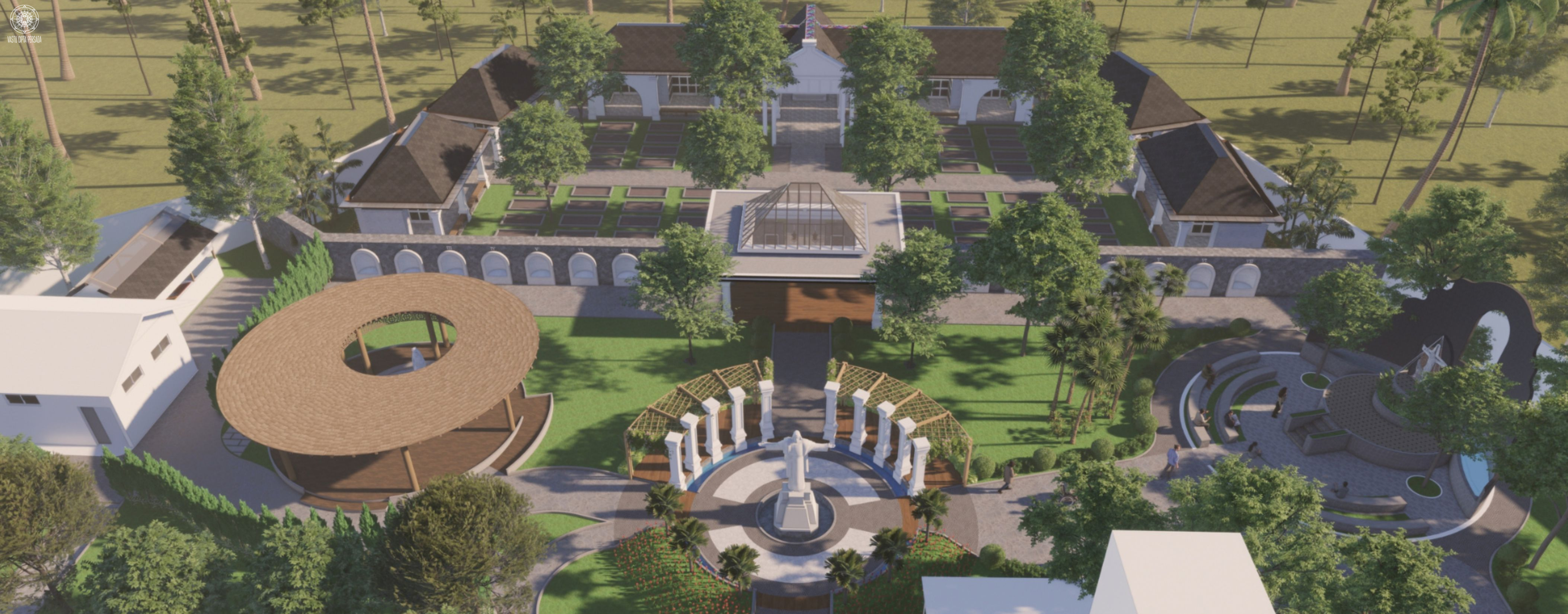 Bangunan dibangun dengan kontemplasi siteplan sebagi berikut. FANA sebagai area Community Plaza, Micro Library, dan Amphiteater Studi. EMOSIONAL sebagai jalan perenungan dan area meditasi pribadi. SPIRITUAL yang merupakan Pendopo Maria Bintang Samudra dan Taman Doa Corpus de Christo. Area Umum yang merupakan Amphiteater dan Parkir Karyawan. Serta Makam dan Columbarium.