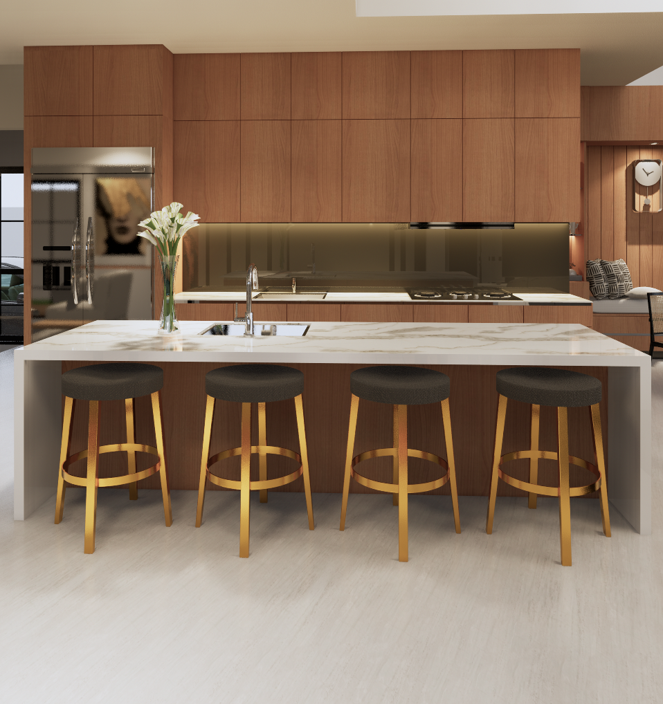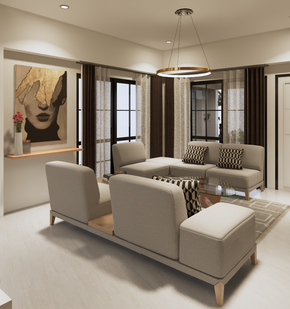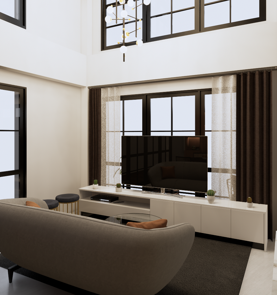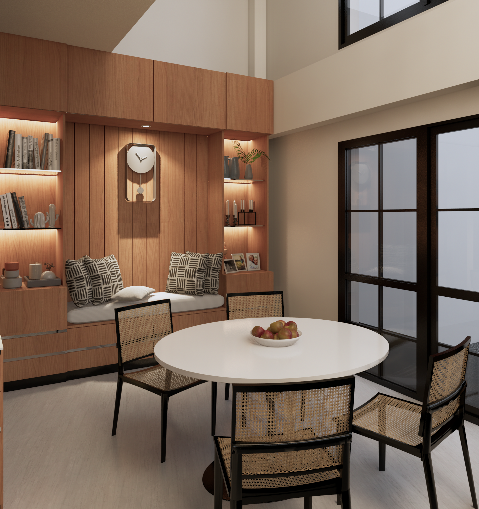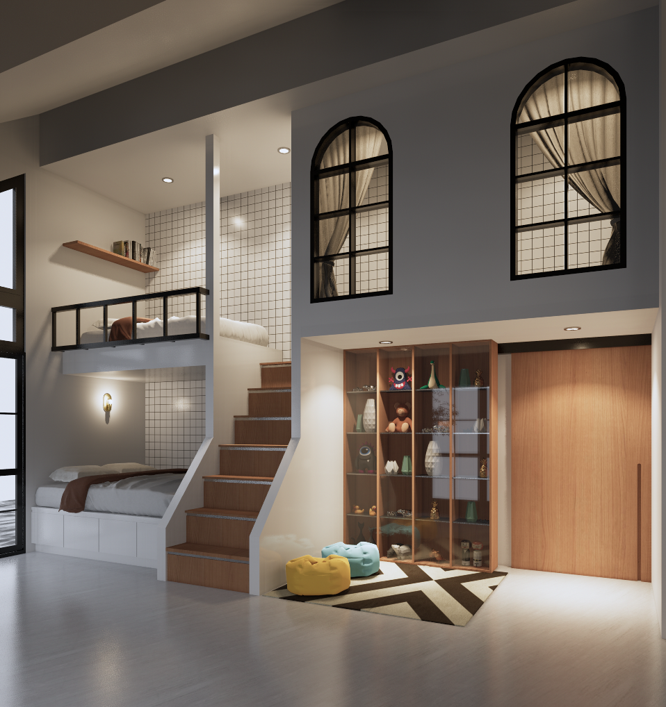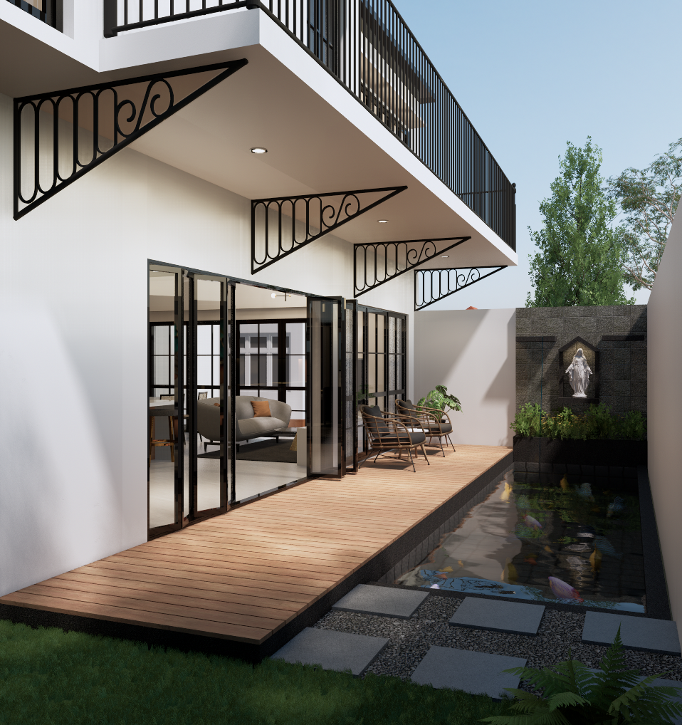 Dari diskusi dengan sang anak sebagai pengguna paviliun, konsep rumah yang diinginkan memiliki tampilan yang minimalis namun tetap megah dari sisi eksterior. Dari sisi tata ruang dan interior, sang anak tidak ingin banyak ruang dan sekat-sekat yang membatasi. Untuk menciptakan kesan megah di sisi dalam, diterapkan konsep mezanine dan bukaan void yang besar di sisi belakang sehingga ada keterhubungan antara ruang-ruang semi privat di lantai 1 dan area kamar tidur di lantai atas.