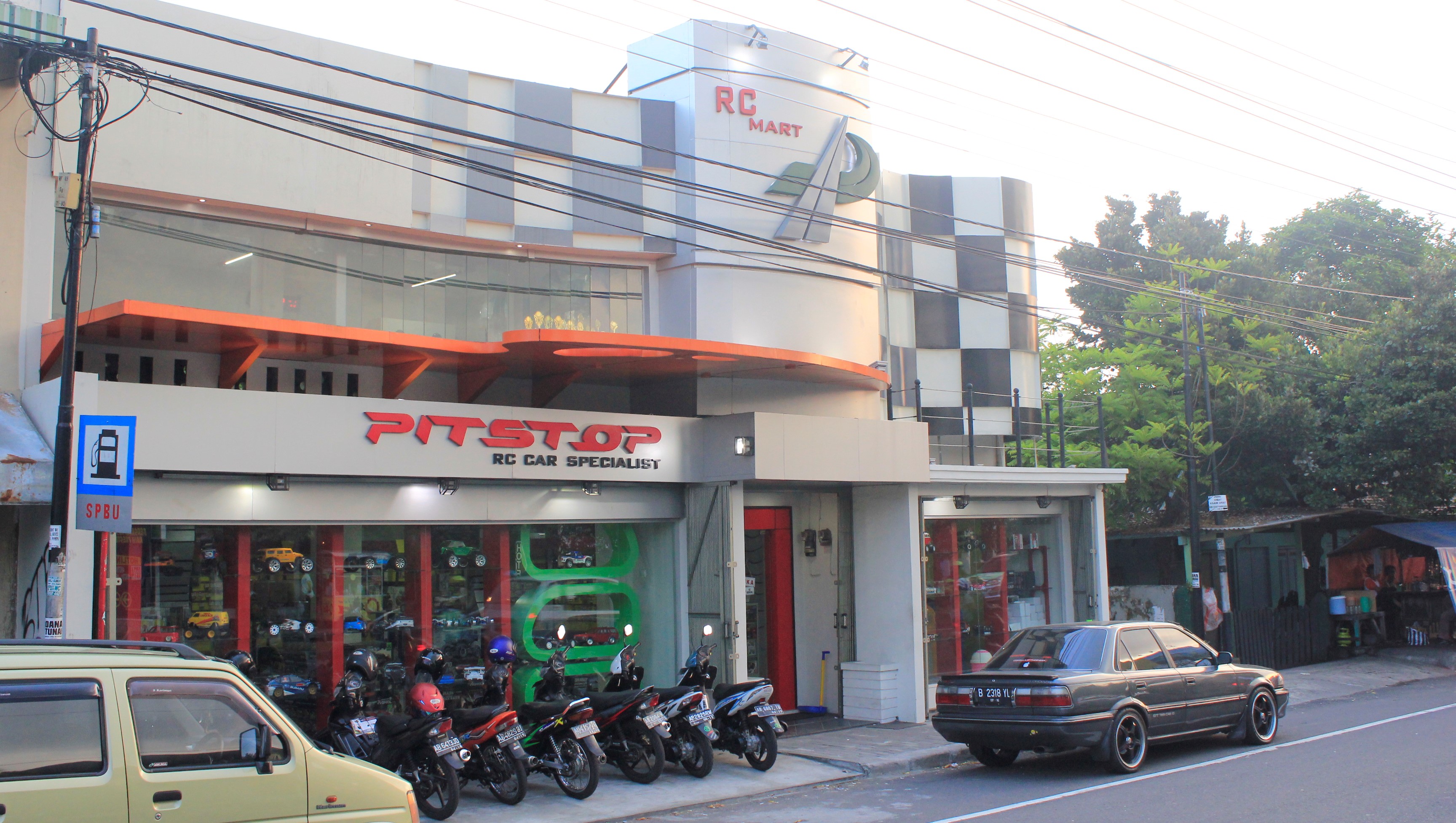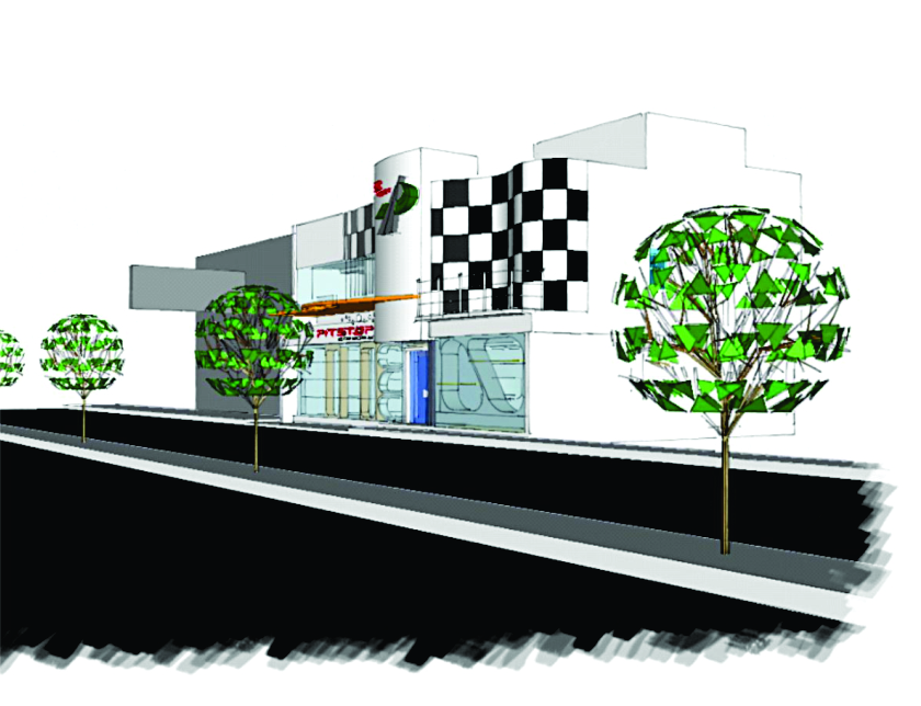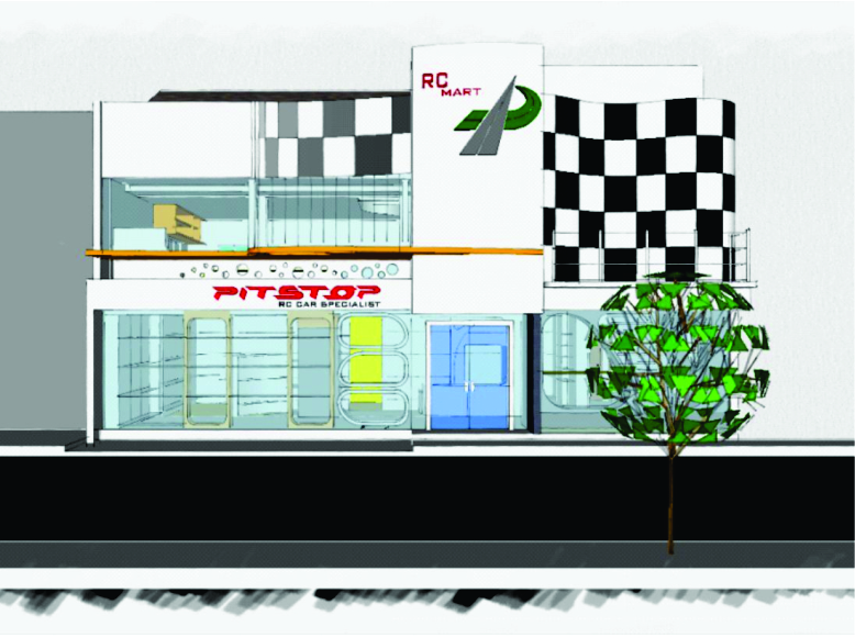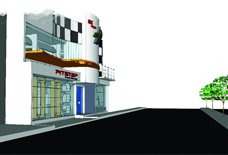 Pit Stop merupakan bangunan komersial dengan fokus usaha penjualan mobil – mobil mainan dengan remote control. Kekhasan ini memberi inspirasi kuat untuk menjadi fokus ide penciptaan bentuk terutama pada bagian fasade bangunan. Alternatif yang dipilih adalah checker flag yang menjadi salah satu indeks kegiatan balapan (race), dengan indeks tersebut diharapkan kehadiran bangunan ini sudah memberi identitas diri yang kuat sebagai tempat usaha yang berkaitan dengan mobil dan balapan.