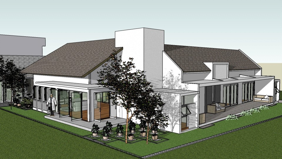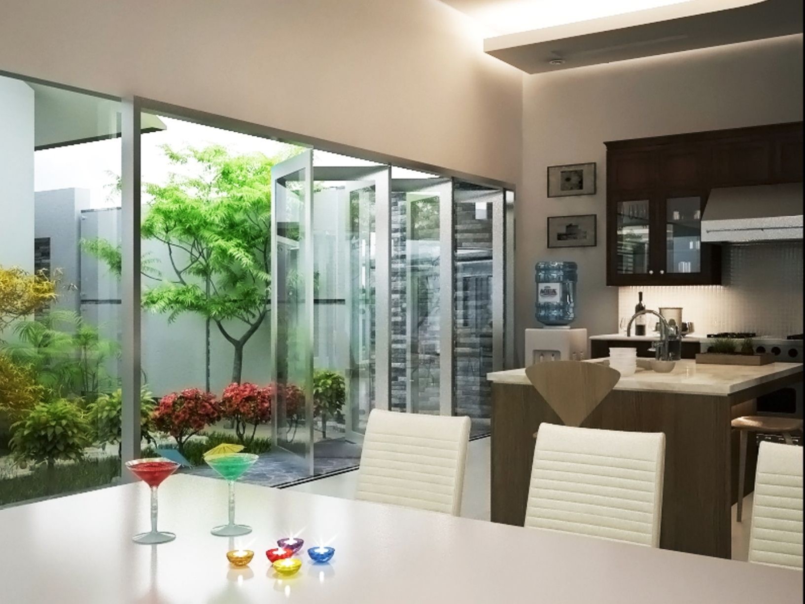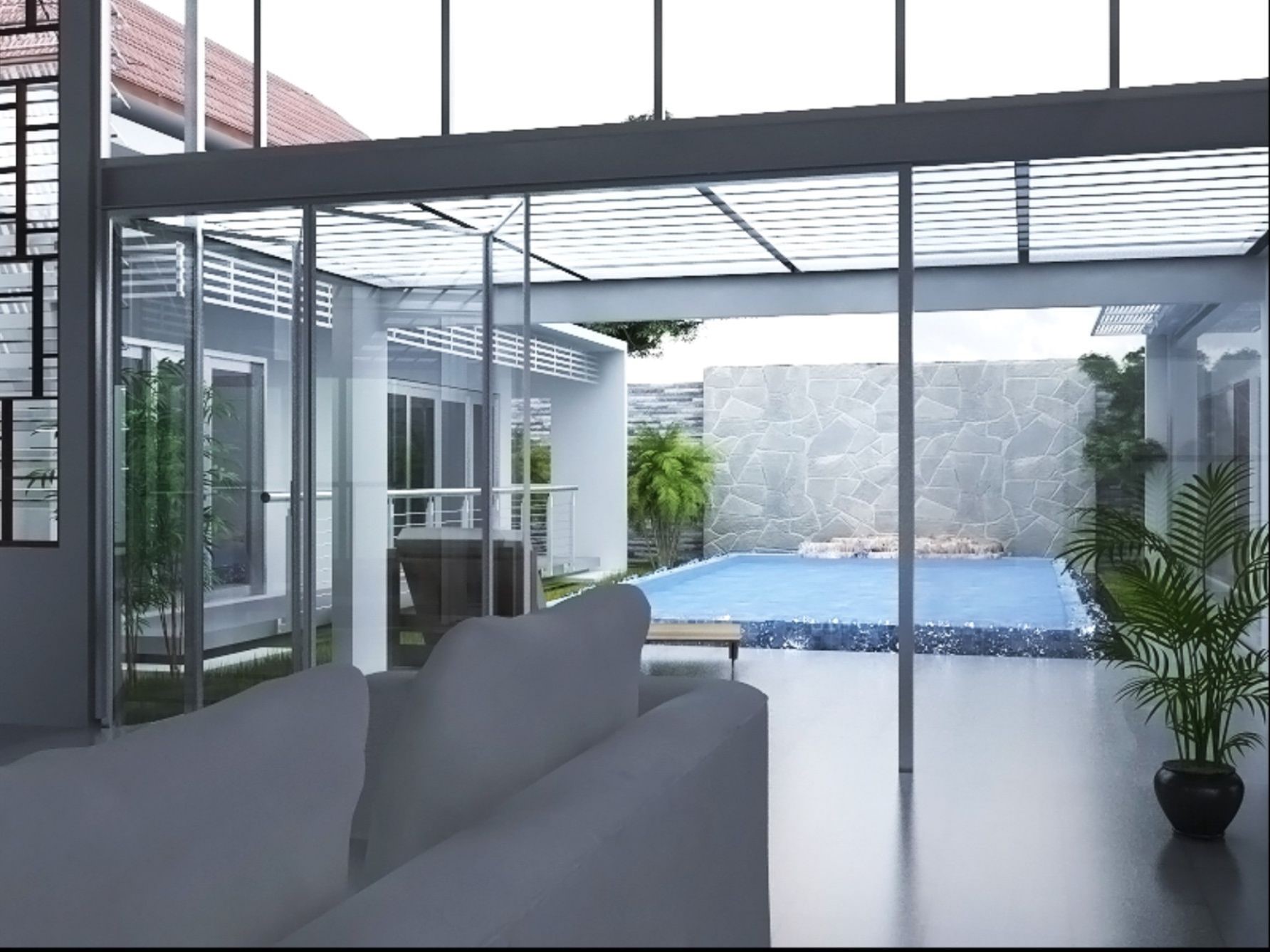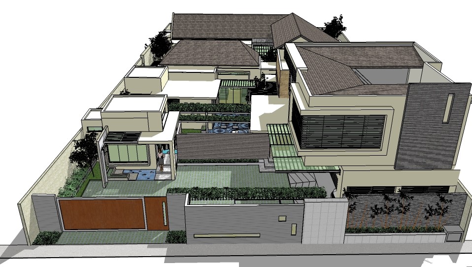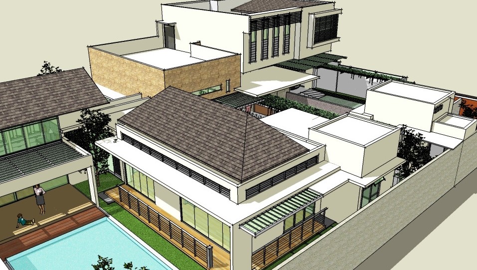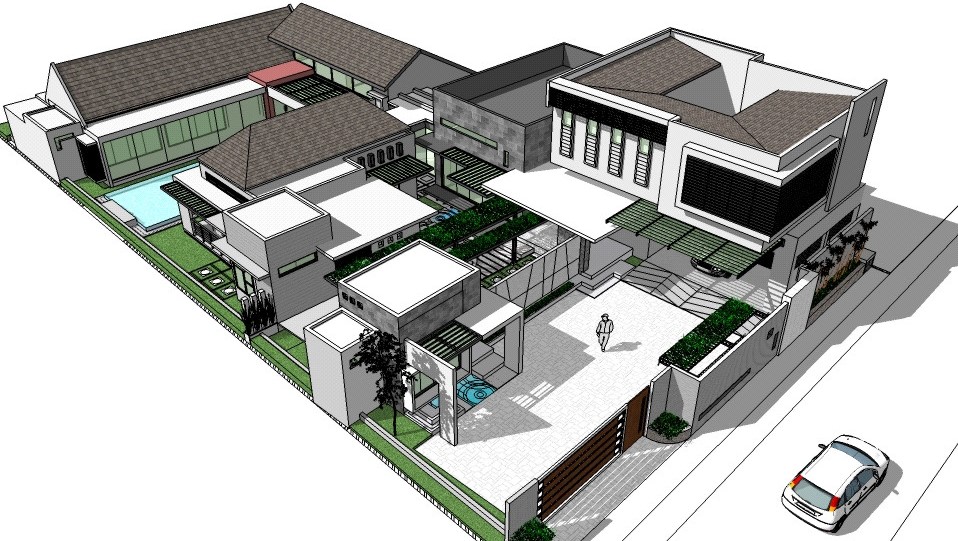 Pemilik rumah adalah seorang dokter yang sibuk dan telah banyak bertemu pasien, maka privasi dan orientasi tata ruang yang diinginkan adalah menjauhkan ruang tamu dari ruang – ruang privat keluarga yang lain. Keinginan untuk lebih berkonsentrasi ke acara keluarga ketika di rumah, direspon dengan massa bangunan yang berdiri sendiri di depan, terpisah dari bangunan utama. Tatanan ini sekaligus mendukung gubahan massa kompon (massa banyak) yang dibutuhkan untuk mengoptimalkan ekplorasi sumber daya alam (sinar matahari dan aliran udara). Besaran ruang – ruang aktifitas rumah tinggal dibuat longgar dan ditata membentuk huruf U berorientasi pada kolam renang sebagai pusatnya. Pintu masuk bangunan ada 2; yang satu bagi tamu yang masuk ke ruang tamu, dan yang lain bagi pemilik yang dapat langsung menuju ke bangunan utama.