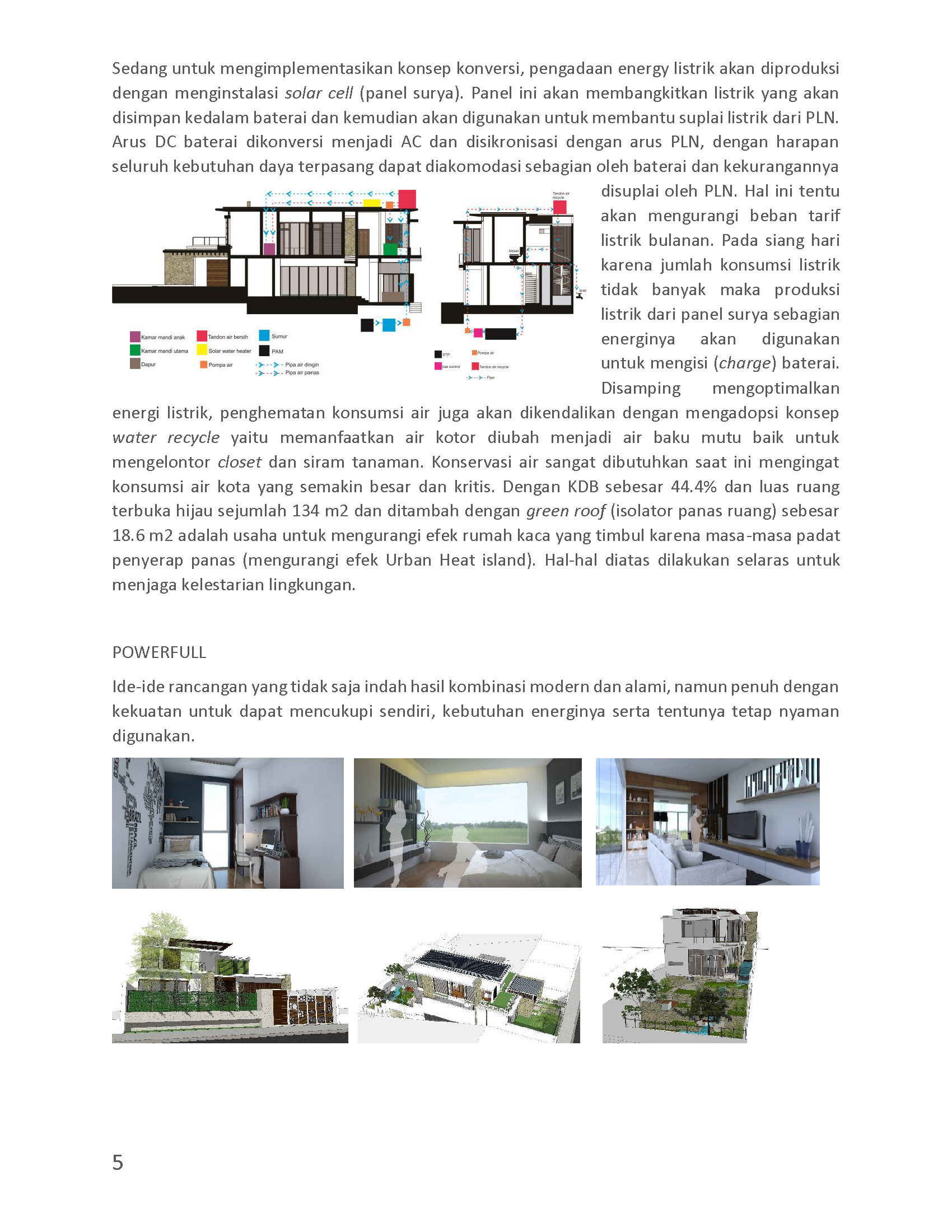 Tata ruang yang rigid dan efisien dicoba untuk dirancang melalui zoning kegiatan yang ketat yaitu ruang privat (ruang tidur) di lantai 2 dan ruang semi privat dan semi publik di lantai pertama. Mempertimbangkan sifat natural lingkungan, mendorong karakter rumah modern ini tanggap pada sifat visual alami, yang akan dicapai melalui pemakaian material batu alam dan bahan-bahan berkarakter kayu. Material tersebut dikomposisi berdampingan dengan karakter modern kaca dan metal serta warna beton membentuk karakter baru rumah kota (urban house) yang asri. Mengingat bahan kayu sudah menipis, penggunaan bahan CONWOOD menjadi pilihan yang diaplikasi pada konstruksi lantai, plafond dan elemen dekoratif dinding. Untuk mempermudah pembangunannya hanya sebagian dari struktur bangunan ini yang utuh adalah beton (kombinasi kolom dan balok tipis untuk membuat kesan simple dan ringan), sebagian besar lainya mengunakan sistim struktur baja profile dengan membrane struktur lantai kaku metal deck.